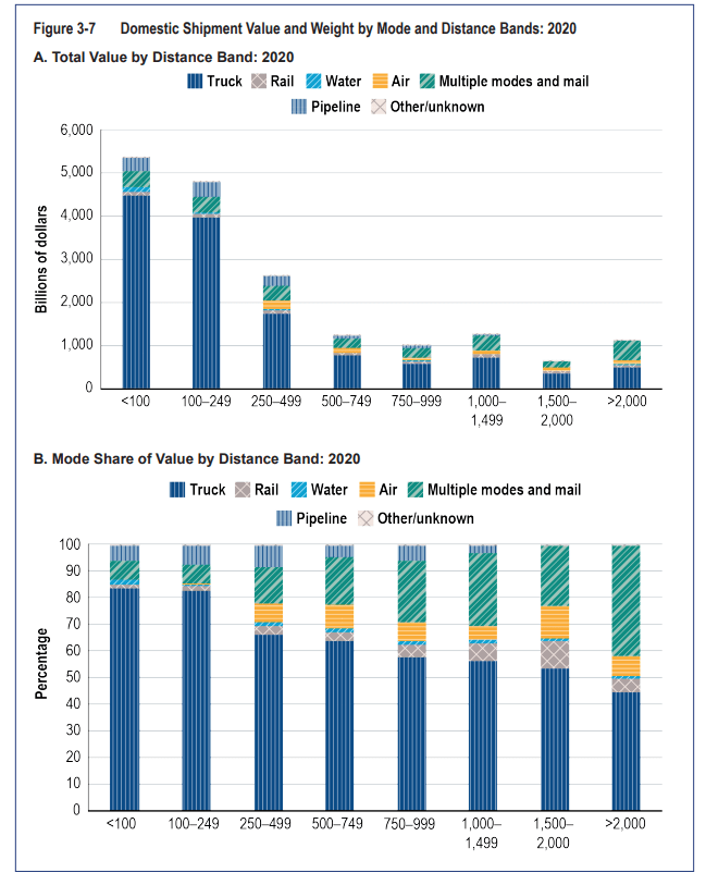 Trucking was the leading transport mode for all distances in 2020 by value, even for distances greater than 2,000 miles