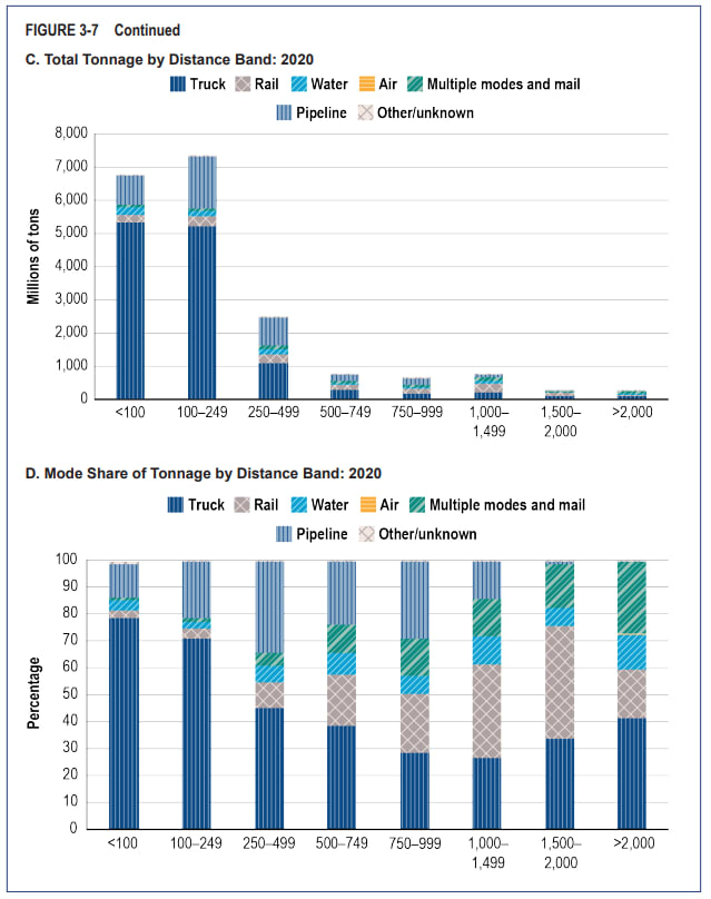 In terms of tons, trucking was the preferred mode to destinations from below 100 miles and up to 749 miles.