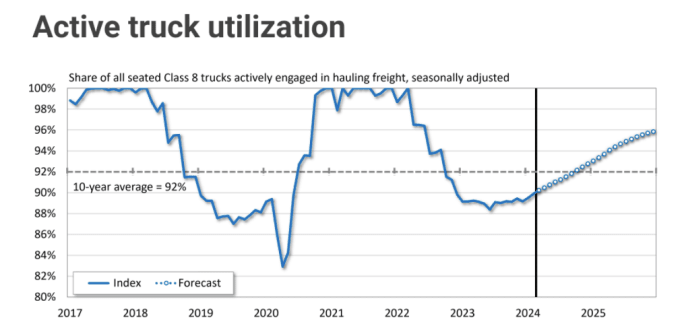 FTR’s active truck utilization peaked at 100% in 2021 and bottomed out around 88% in 2023. Vise said once that utilization index hits around 92%, it starts to exert upward pressure on rates.
