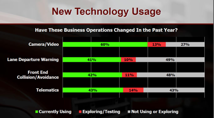 Safety technology: Use of technology is growing, such as camera/video systems, lane departure warning, front end collision avoidance/mitigation, and telematics.