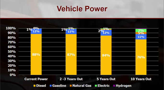 Powertrains: While diesel is expected to continue to be the dominant fuel over the next decade, MacKay said it will drop from the current 88% to 76%, thanks to growth in electric and natural gas vehicles.