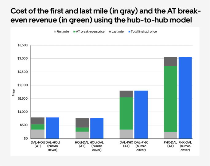By analyzing historical carrier pricing data, Uber said, it found this model is feasible to all stakeholders on 80% of lanes if AV carriers can achieve a middle-mile cost of $1 per mile, and on 40% of lanes with a middle-mile cost of $2 per mile.