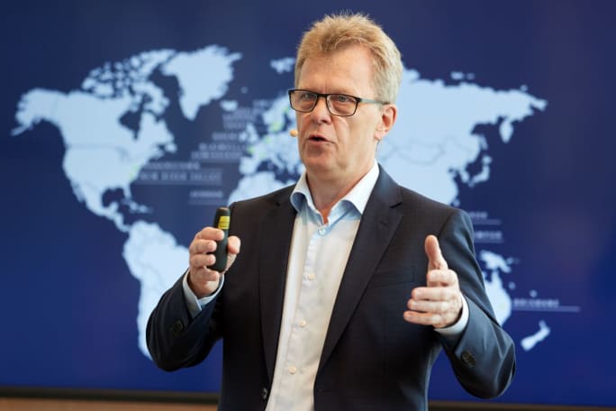 Volvo Trucks President Roger Alm discusses the OEM's Three-Pillar Decarbonization Plan with North American journalists at Volvo Group headquarters in Gottenburgh, Sweden.