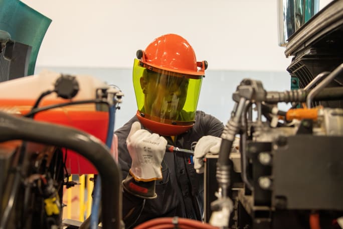 A trained technician wearing personal protective equipment removes the junction box on a Volvo VNR Electric truck to verify there is no voltage in the traction voltage system.