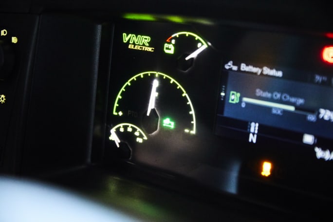 The VNR Electric features that same chassis as the diesel version, without the diesel engine and traditional transmission. It uses conventional drive axles with gear ratios matched to the application and speed of the motors. Drivers will find a familiar human-machine interface with a few differences in the gauge package, such as state-of-charge indicators, rather than tachometers, oil pressure gauges, etc.