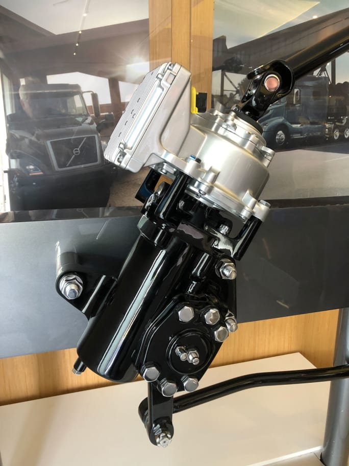 Volvo Dynamic Steering consists of an electric motor mounted on the power steering gear. The steering column runs through the motor to the steering gear.
