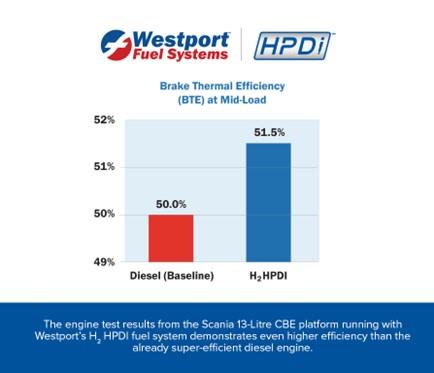 Westport, Scania Hydrogen Fuel System Achieves 52% Brake Thermal Efficiency