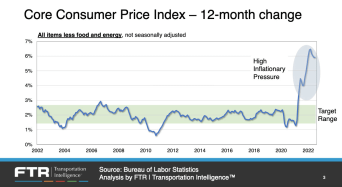 Kauffman, saying inflation may have peaked in June, broke down the key components of inflation. Looking at a variety of commodity prices — corn, heating oil, aluminum, steel, etc. — and truckload spot rates and other indicators, he said, “We’re starting to see a little pull back in inflation,” although he noted it’s still high, averaging about 6% core for the last three months.