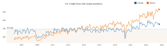 “And, of course, these are the two countries where the trade is conducted primarily by truck rather than intermodal container, aircraft, etc.,” notes Avery Vise, VP of trucking for FTR Research.