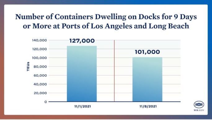 The White House said it is starting to see improvement in the container-ship backlog at the southern California ports.