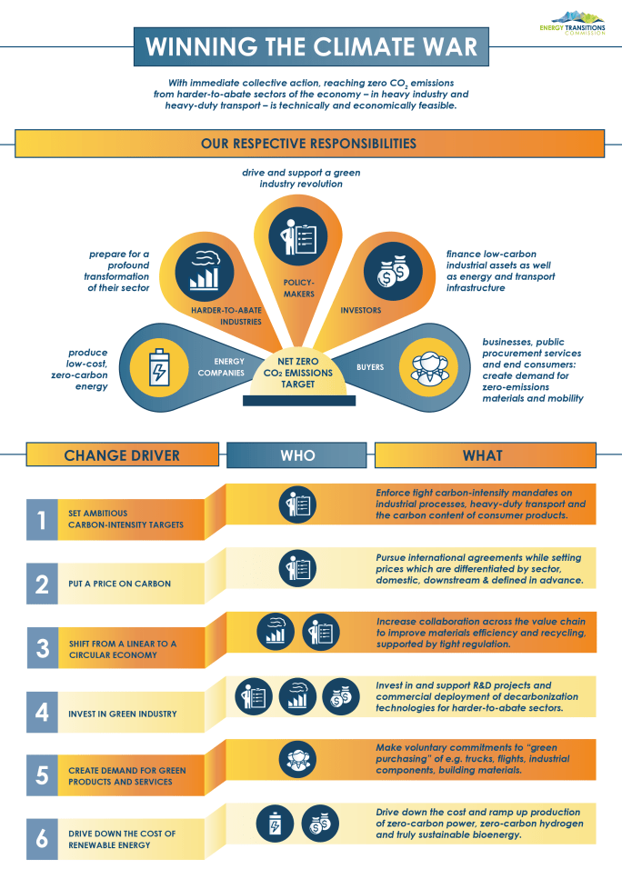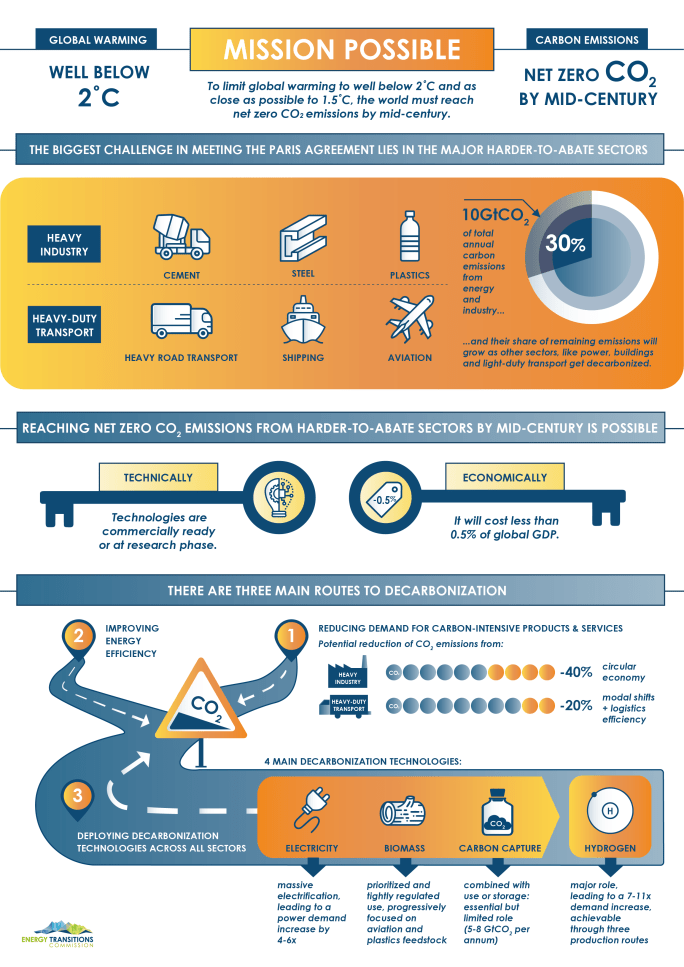 A new report by the Energy Transitions Commission shows that reaching net-zero carbon emissions from heavy industry and heavy-duty transport can be done through ambitious policy, accelerated innovation, and investment, with minimal cost to the global economy.