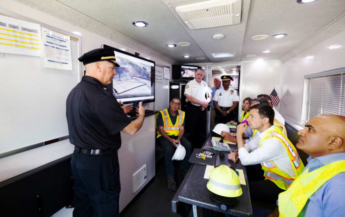 U.S. Transportation Secretary Pete Buttigieg is briefed during his visit to the site.