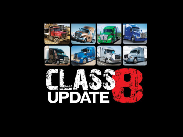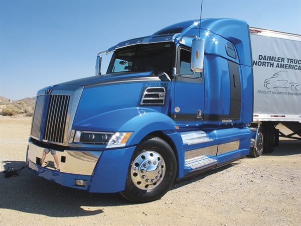 Daimler’s premium brand just introduced the 5700XE (shown), a distinctively styled aero model aimed at owner-operators and image-conscious fleets. It has sculpted fenders, hood and grille, and a specially end-capped bumper that all smooth air flow. The 5700XE is said to be aerodynamically second only to Freightliner’s Cascadia series, and promises fuel savings of up to 7.2% compared to a base 4900 model. It may replace the semi-aero 4900FE, and will come only with Detroit diesels. Detroits and Cummins’ ISX15 can be had with versions of the 4900, and the ISL9 and DD13 in the lighter 4700. The medium-hood 4800 comes only with the DD13, and the extreme-duty off-road 6900DX gets Detr