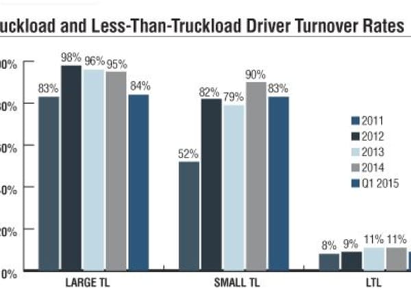 Annualized turnover rates at large and small truckload fleets fell by 12 percentage points in the first quarter of 2015, according to the American Trucking Associations, but it expects turnover to edge higher later in the year. (Large truckload fleets are defined as those with more than $30 million in revenue.)