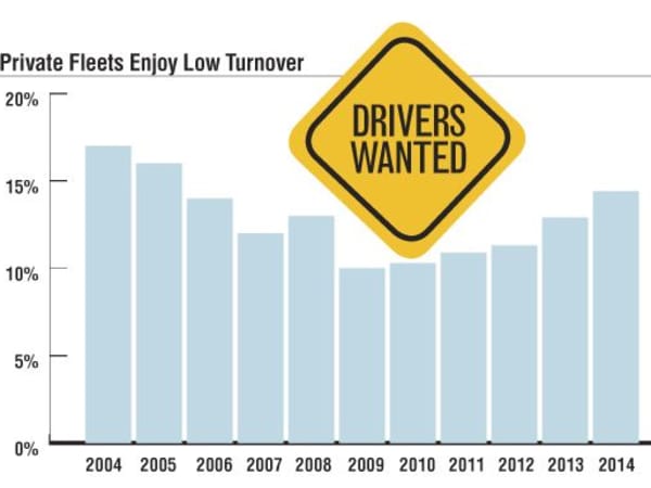 Private fleets have traditionally enjoyed much lower turnover than on-highway for-hire carriers, but even that number has been increasing in recent years, reflecting the broad-based driver shortage.