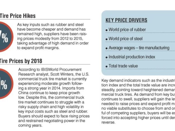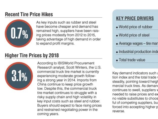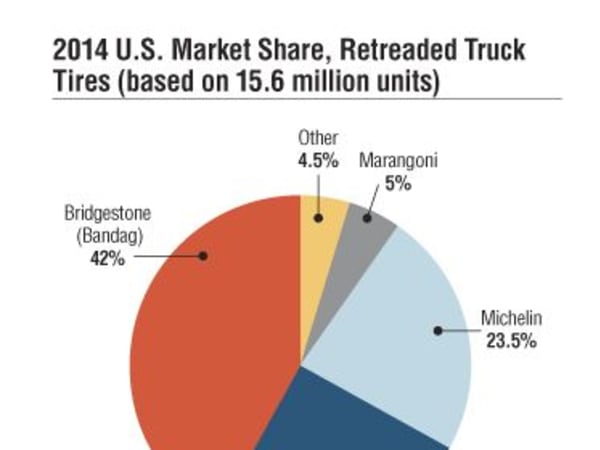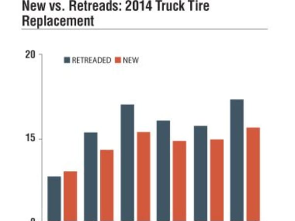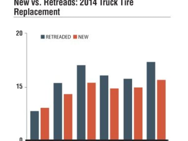 In 2014, the average price of a retreaded truck tire in the U.S. was $237.48. The average price of a new tire was $381.50. Before 2009, the number of retreaded truck tires produced last topped new truck tire shipments in 2004.
