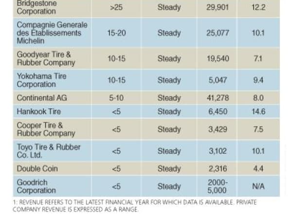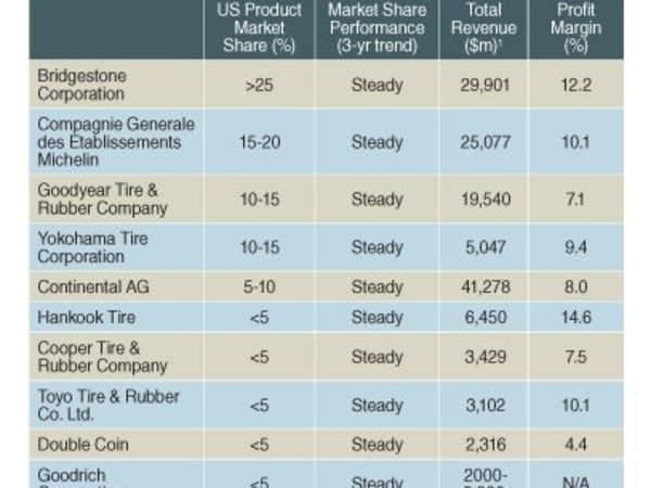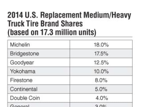 Tire makers don’t typically share this information, but here’s how industry analyst IbisWorld sees the top 10 North American commercial tire producers.