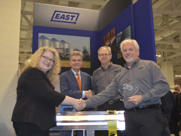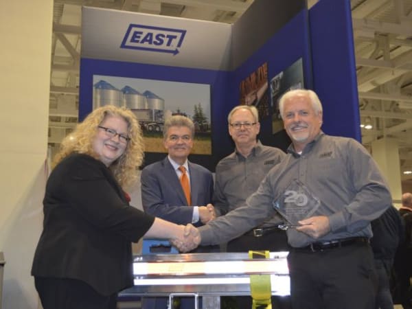 From left, HDT Editor in Chief Deborah Lockridge and Publisher David Moniz present the Top 20 Award to East's Charlie Wells, VP of sales and marketing, and David de Poincy, president and CEO, for the integrated aluminum side-rail system that accommodates a Double-L winch with flat-hook straps for cargo securement.