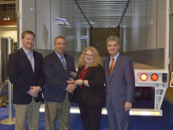 From left, Stoughton Trailers President and CEO Bob Wahlin and VP Engineering Gary Fenton accept the Top 20 Award from Editor in Chief Deborah Lockridge and Publisher David Moniz for developing a stronger rear underride guard without weight or price tradeoffs.