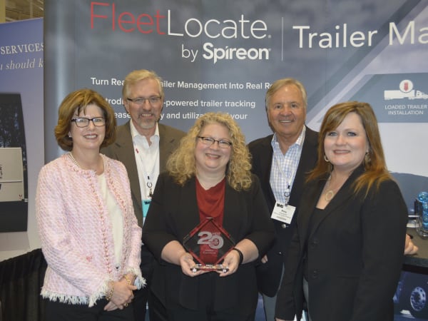A group from Spireon accepts the HDT Top 20 Products Award from Editor in Chief Deborah Lockridge, center, for the FleetLocate solar-powered trailer tracking telematics system, including Roni Taylor, VP of industry relations, on left, and Belinda Rueffer, director, product marketing, on right.