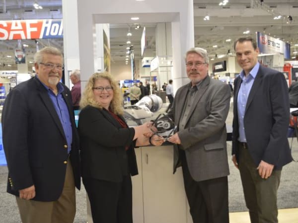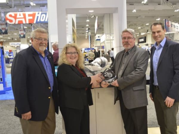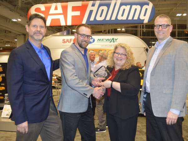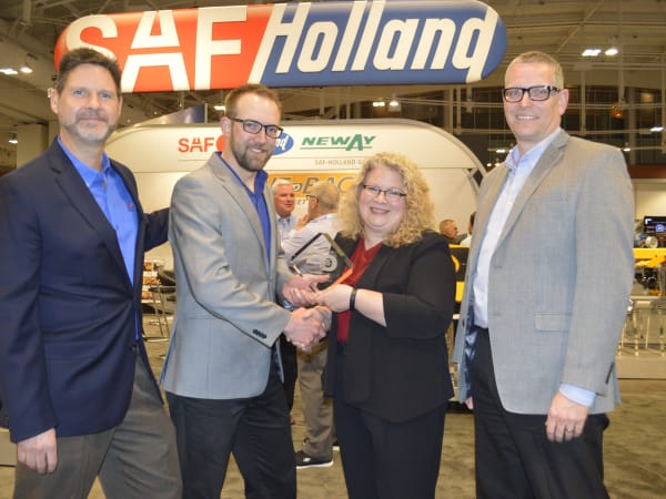 SAF Holland was honored for its ELI-te fifth wheel lock indicator. From left, Mark Molitor, VP Engineering-Americas, and Andrew Wallner, senior project engineer, accept the Top 20 award from HDT Editor in Chief Deborah Lockridge while Steffen Schewerda, president Americas and SAF-Holland Inc., right, looks on.