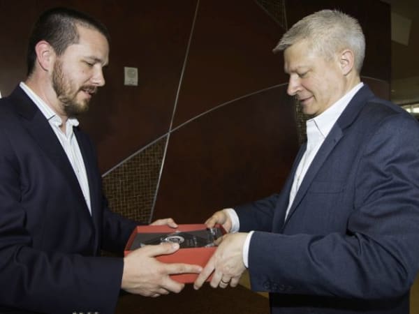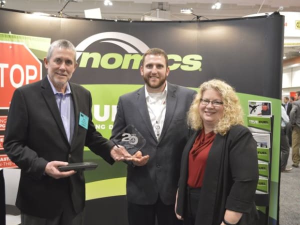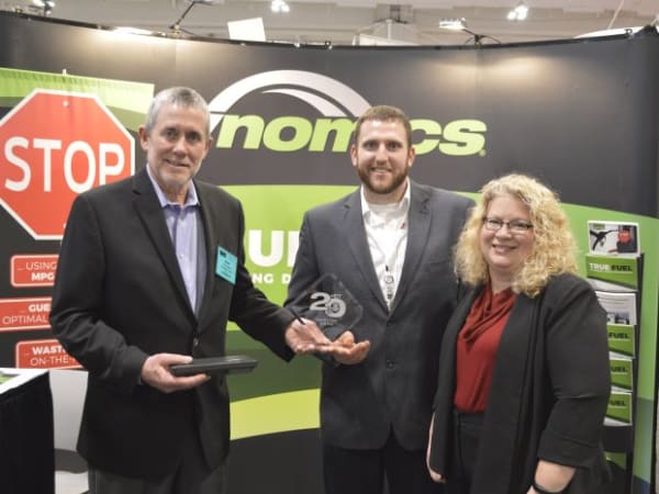 From Left, CEO Alan Farnsworth and Robert Magnant, VP, product management & strategy, for Vnomics, accepts the Top 20 Award from HDT Editor in Chief Deborah Lockridge for the TrueFuel driver coaching and analytics system.