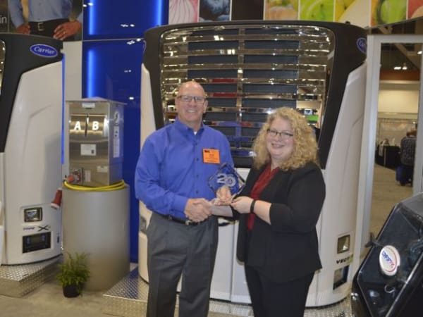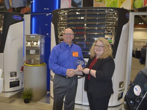 Scott Williams, south regional director for Carrier Transicold, accepts the Top 20 Award from HDT Editor in Chief Deborah Lockridge for its two-way, customized telematics system.