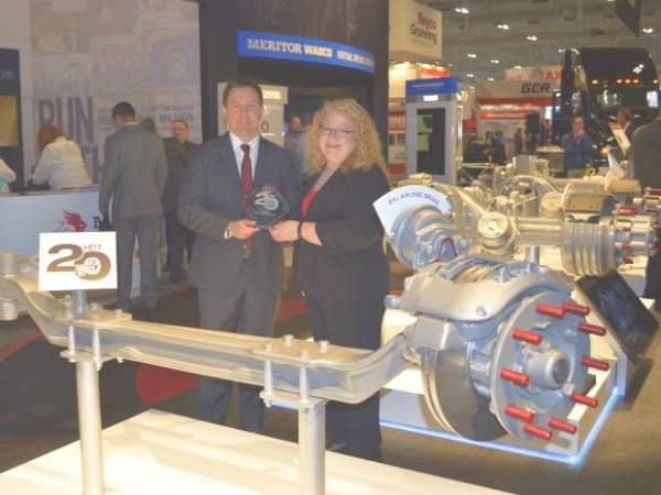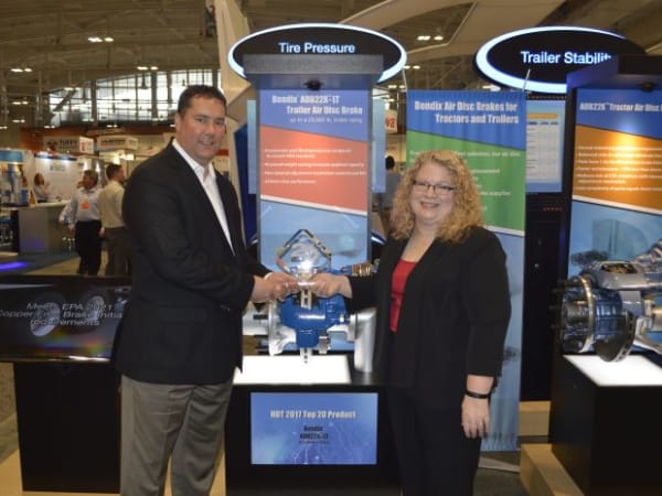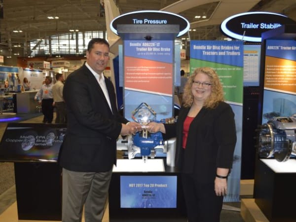 Keith McComsey, Bendix Spicer Foundation Brake director of marketing and customer solutions, accepts the Top 20 Award from HDT Editor in Chief Deborah Lockridge for the ADB22X-LT air disc brake for trailers.