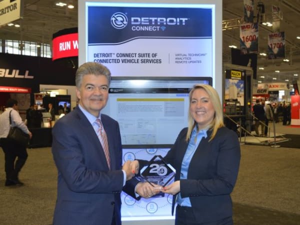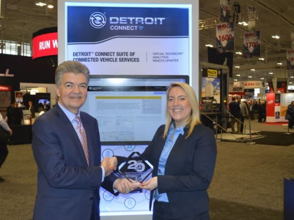 Detroit Analytics Connected Vehicle Services earned a Top 20 Award, presented by HDT Publisher David Moniz to Lauren Attinasi, product strategy manager-connectivity.