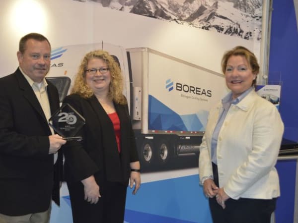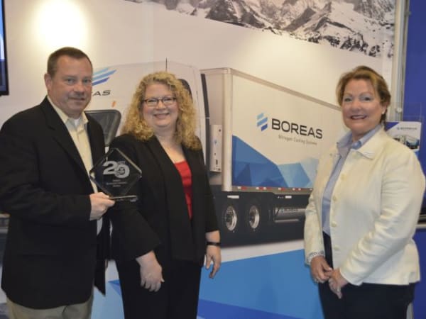 Fred Norvell, and Joanne Bjick, right, both of Boreas Nitrogen Cooling Systems, accept the Top 20 Award from Deborah Lockridge, HDT Editor in Chief, for their innovative new trailer refrigeration system.