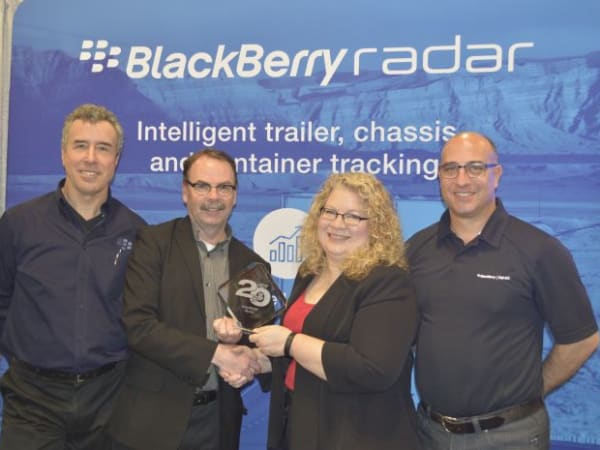 Showing that Blackberry is more than phones, from left, Peter Logan, senior sales manager, IoT, Steve West, senior director, business development, IoT, accept the Top 20 Awrd from Editor in Chief Deborah Lockridge for the Blackberry Radar asset tracking system. At right is Aaron Lalvani, senior director, business development, IoT, for Blackberry.
