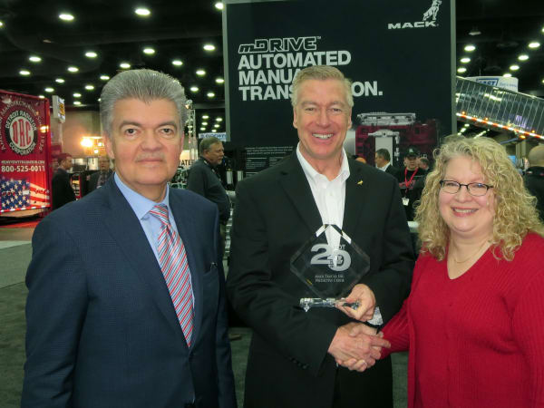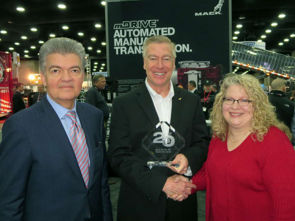 John Walsh, Mack VP of marketing, center, accepts the Top 20 award from HDT Publisher David Moniz, left, and Editor in Chief Deborah Lockridge, right, for Mack's Predictive Cruise Control at the Mid-America Trucking Show. Predictive Cruise memorizes thousands of traveled routes and uses that knowledge to keep a truck in the most fuel-efficient gear possible.