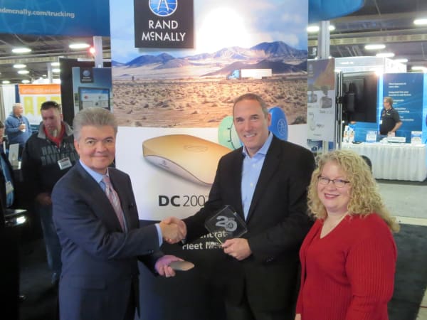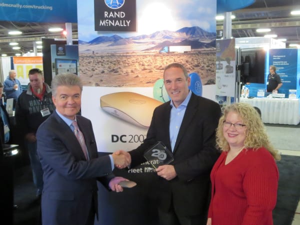 Rand McNally garnered a Top 20 Product honor for its DC 200 "bring your own device" ELD. CEO Stephen Fletcher, center, accepts the Top 20 award from HDT Publisher David Moniz, left, and Editor in Chief Deborah Lockridge.