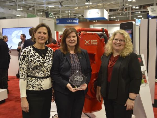 From left, Amy Boerger, VP of sales, and Lori Cobb, VP, connected solutions, at Cummins accept the Top 20 Award from Editor in Chief Deborah Lockridge for the Cummins X15 diesel engine.