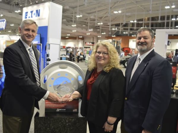 Accuride's Craig Kessler, VP engineering, left, and Dennis Winn, director of technology & business development, right, accept the HDT Top 20 Award from Editor in Chief Deborah Lockridge for its EverSteel wheel technology.