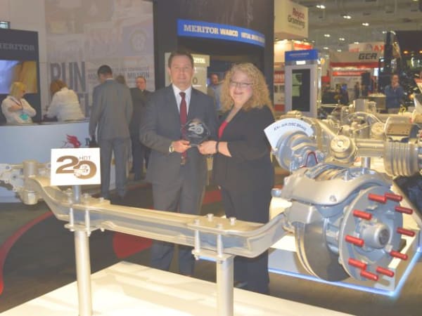 T.J. Reed, general manager, front drivetrain, North America, for Meritor, accepts the Top 20 Award from Editor in Chief Deborah Lockridge for the lightweight MFS+ steer axle.