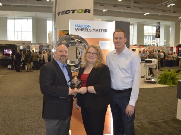 Matt Kominars, left, director of North American sales, and Joseph Wolf, right, manager of innovation and advanced engineering, accept the Maxion Wheels Top 20 Award from Editor in Chief Deborah Lockridge for the MaxSmart connected wheel safety system.
