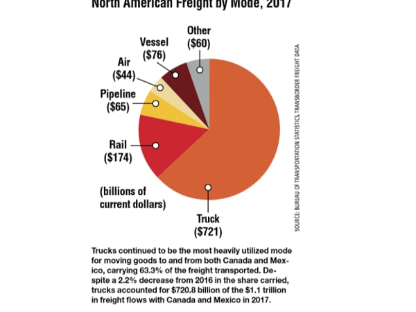 Trucks continued to be the most heavily utilized mode for moving goods to and from both Canada and Mexico, carrying 63.3% of the freight transported.