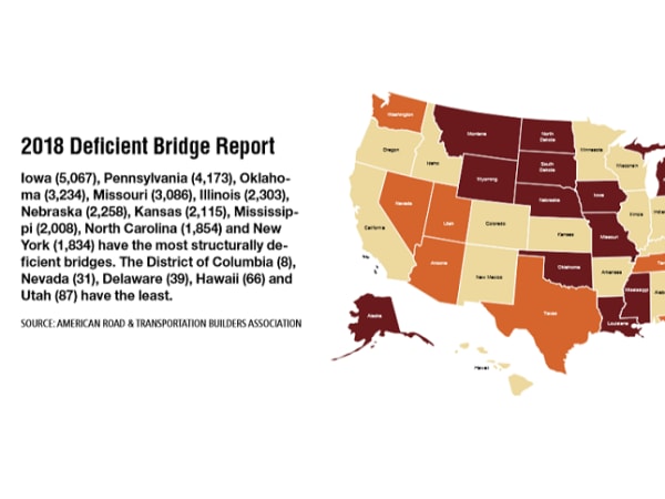 Iowa, Pennsylvania , Oklahoma, Missouri, Illinois, Nebraska, Kansas, Mississippi, North Carolina and New York have the most structurally deficient bridges.