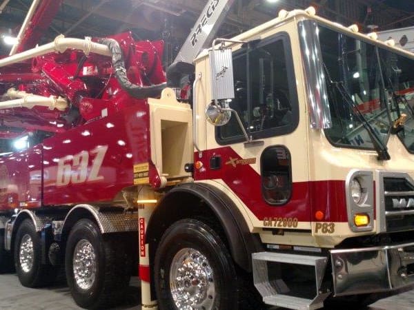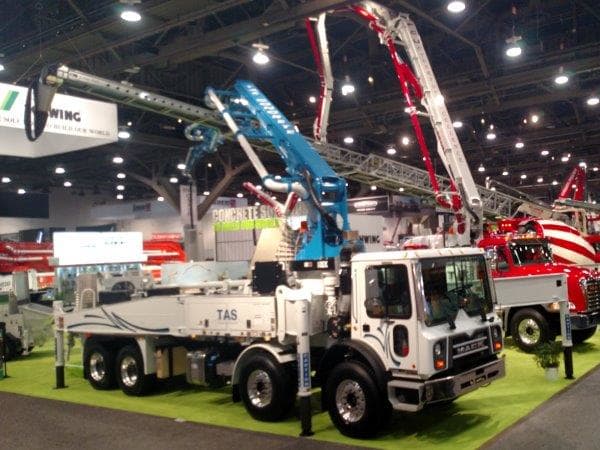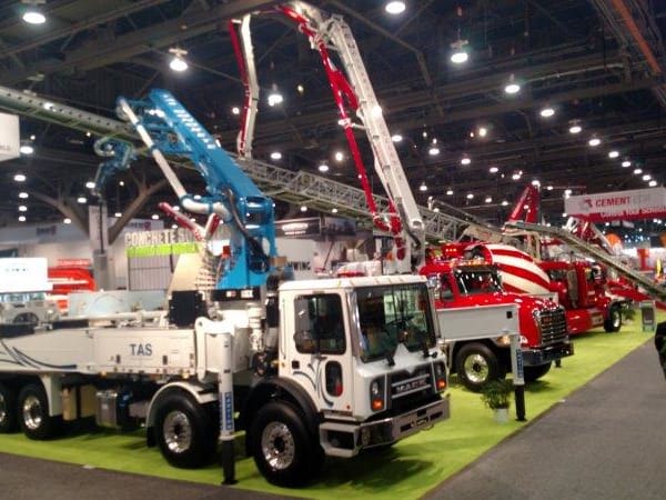 Concrete pumper trucks line aisles of the Las Vegas Convention Center's central hall, where most heavy truck displays are housed. Numerous mixer trucks are also here.