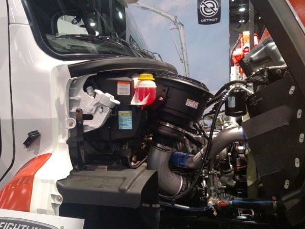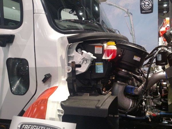 Detroit's new DD8 diesel nestles in a Freightliner 108SD. The 7.7-liter inline 6-cylinder engine will be an alternative to Cummins' 8.9-liter L9 in medium- and medium--heavy truck models.