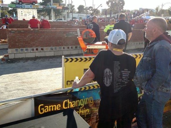 Masonry Madness competition had workers matched their speed and skills in laying courses of bricks and blocks. Masonry tools and materials were a large part of the annual show.