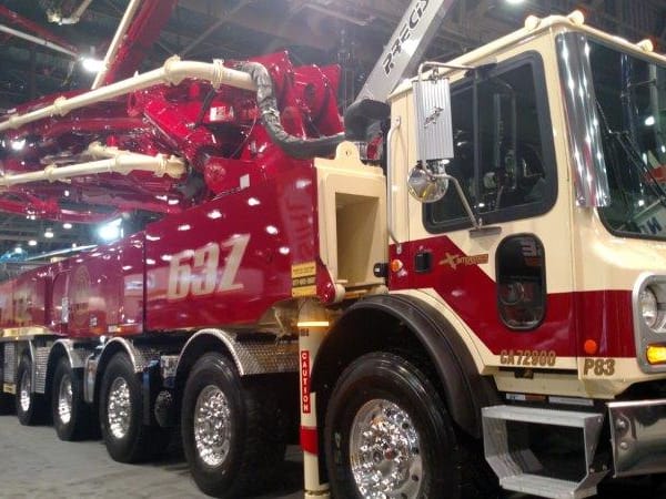 Mack's MR is the chassis chosen for most large pumpers, like this Putzmeister 63Z. The number indicates total boom length in meters. Multiple axles are needed to support the machinery.