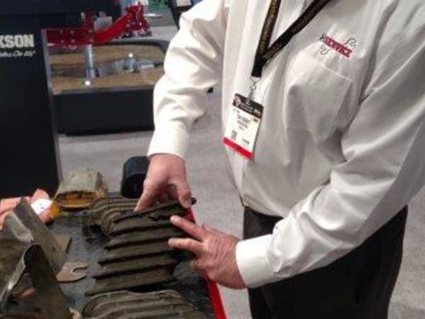 Tony Kockritz, Hendrickson's western service manager, set up a table of worn suspension parts to show operators what to look for when inspecting s truck. Here he indicates deteriorated rubber bolster springs from a Haulmaax tandem.