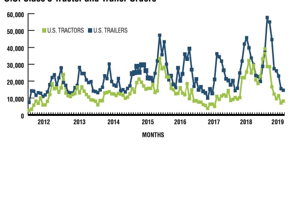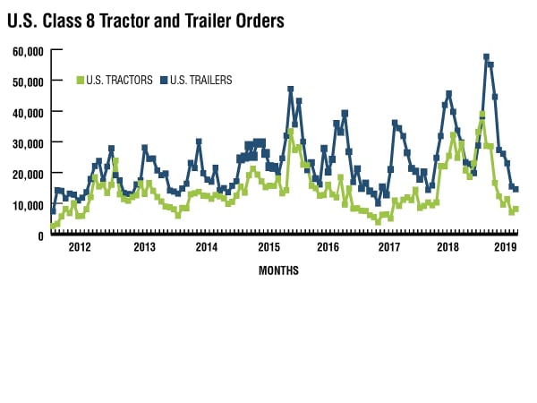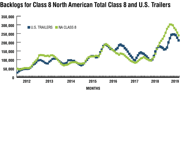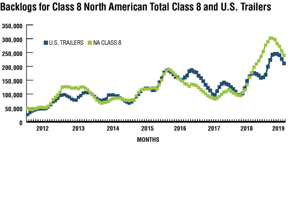 For U.S. Class 8, orders averaged 40,800 units per month in 2018, but for the first half of 2019, just 14,600 per month. Similarly, U.S. trailer orders averaged 35,100 units/mo. in 2018, and have managed just 13,500 units per month in the three months ending May. Much of the weakness in orders in the first half of 2019 is a reflection of the strength in orders in 2018 and the large, filled backlogs at the start of the year. We are just at the point where the order focus will shift to 2020, so weakness from here on out will be more indicative of future activity than the order weakness experienced year to date.