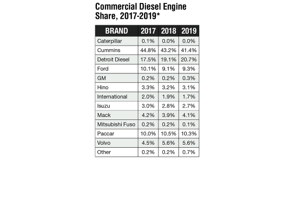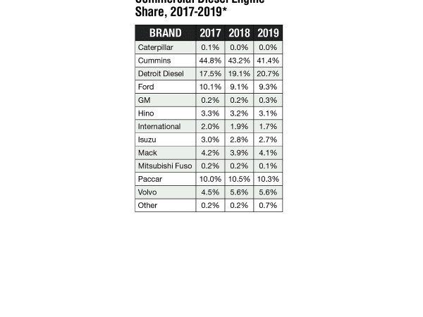 While Cummins has lost approximately 2.5% of its market share since 2017, it still retains close to 50% of the overall diesel engine market. Aside from Detroit Diesel, which saw a 3.2% growth in terms of market share, the remaining manufacturers have only lost or gained a portion of a percentage point over the last two years. Note: Diesel engine shares are calculated for Class 4-8