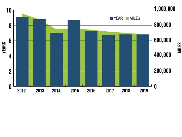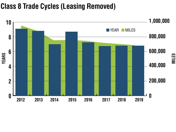 To get a more complete picture of the trade cycle strategies, when those fleets that lease the majority of their equipment were removed, the trade cycles lengthened slightly to 6.8 years (exactly the same as last year’s reported average and up from the previous year’s 6.75 years. Equipment turns averaged 649,000, down from the 665,000 miles reported last year and down from 681,200 miles for this same class of vehicle reported two years ago. For comparison purposes, in 2015, trade cycles for this same class averaged 8.74 years and 717,000 miles reported last year. Even those fleets that lease the majority of their equipment report extending the trade cycle out to 5.5 years and 580,000 miles.
