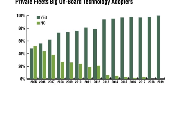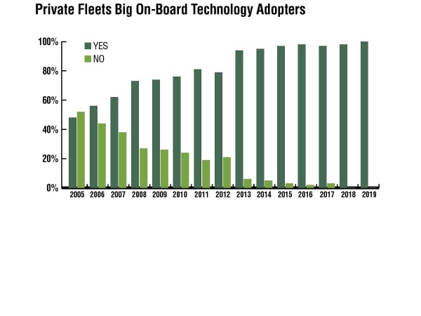 One effective strategy private fleets continue to employ to help improve their productivity is the deployment of on-board technology — combined with better data aggregation and analysis — to track and improve various elements of their performance. Fleets have been steadily adopting such technology and this year, every fleet that answered the question in NPTC's annual member survey reported adopting the technology. This is in line with the near universal penetration of on-board technology achieved in each of the last seven years. To put that number in perspective, in 2005, the penetration of on-board technology was reported at less than 50%. On-board technology provides data that can lead to more effective methods to understand, communicate, and improve value, performance and safety. The challenge and frustration expressed on the part of the fleets is to detangle the massive amounts of data and convert it into actionable intelligence. In fact, 29% of the respondents reported employing data analysts or information technology experts.