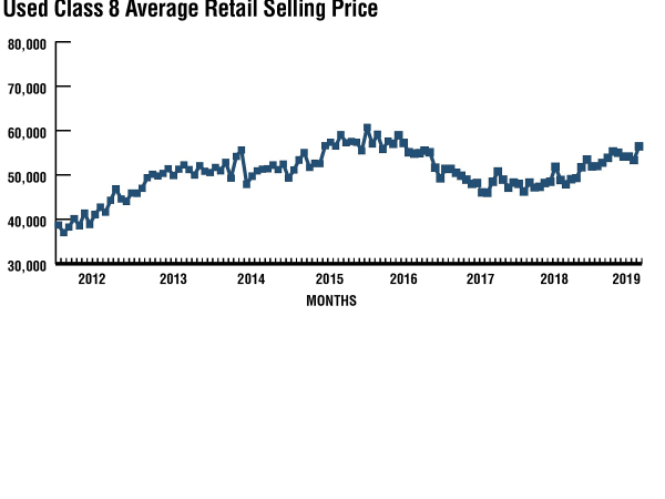 Despite the slowdown in orders and falling backlogs, demand for used equipment persists at high levels. In April 2019, average used prices were up nearly 15% from a year earlier. Strength in used equipment, like new equipment, is attributed both to strong carrier profitability tailwinds into 2019 and the rapid improvements in technology and fuel economy that have come into the fleet in the current decade. Replacing an older truck with a fuel-efficient late model truck will help to offset falling freight rates.