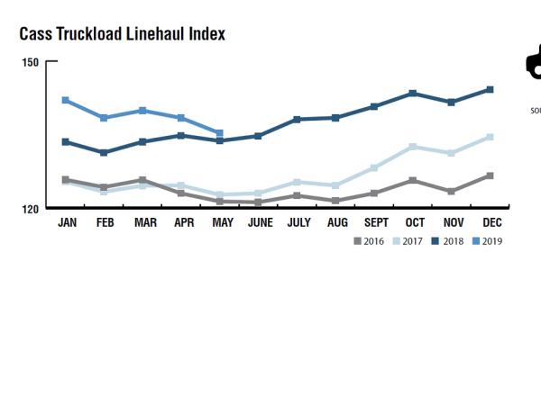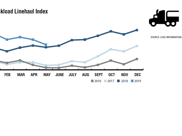The Cass Truckload Linehaul Index is a measure of market fluctuations in per-mile truckload linehaul rates, independent of additional cost components such as fuel and accessorials. Since January, there has been a steady decline through May 2019.